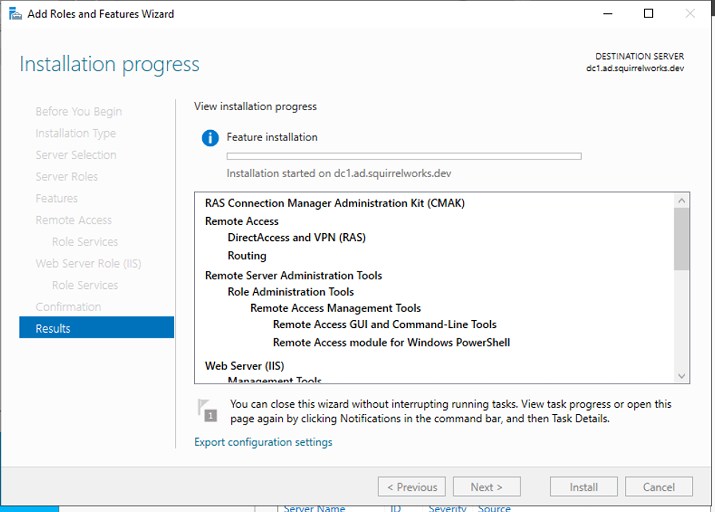 The server was promoted to a Domain Controller for AD.SQUIRRELWORKS.DEV.